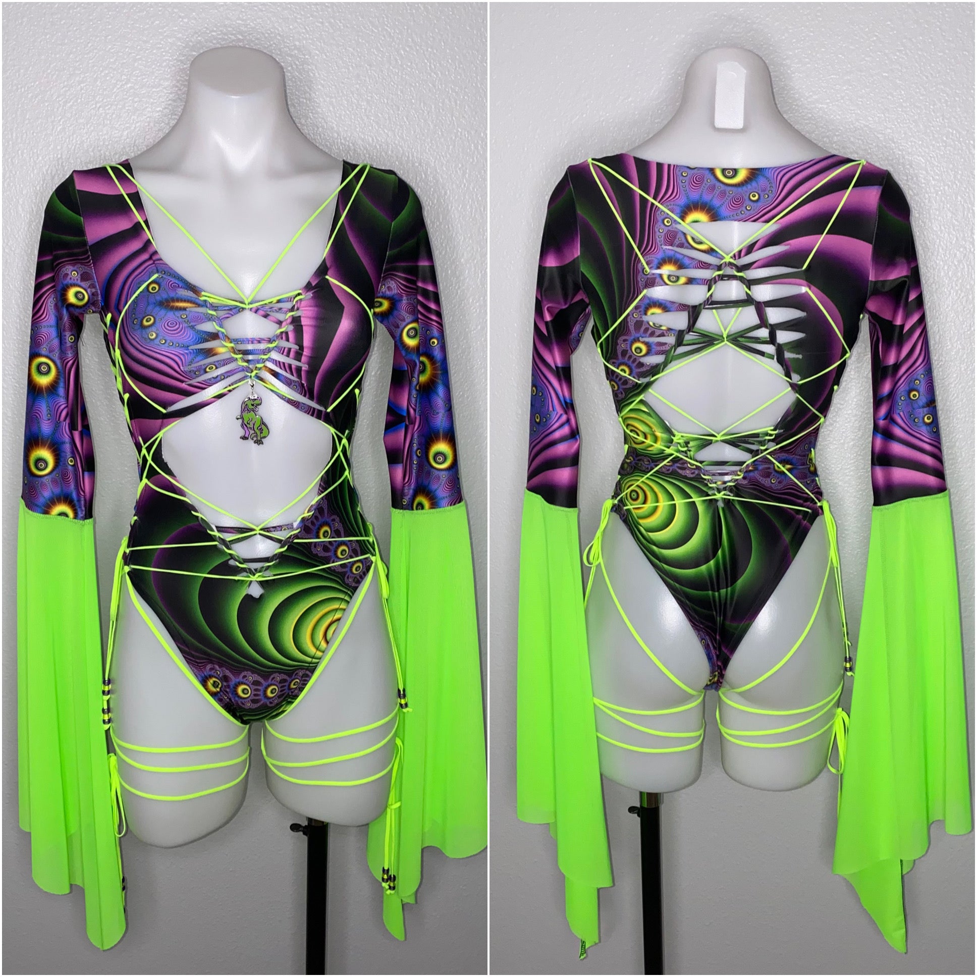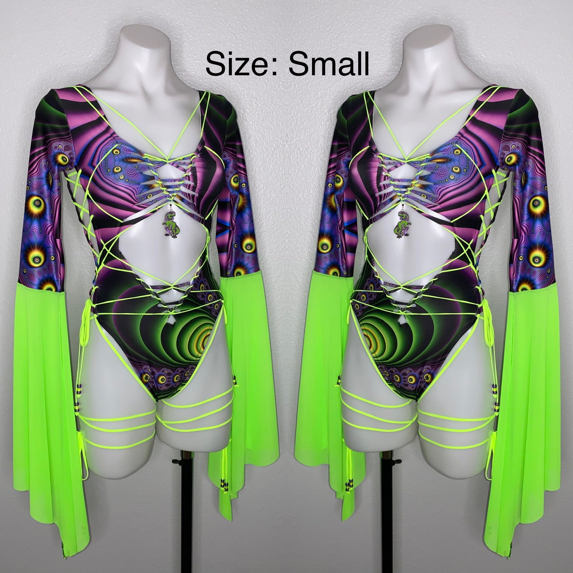 Fabric of bodysuit is one layer of polyester/spandex blend (4-way stretch) and sleeves are power mesh. Pumayana Artwork print and TinyHandsCult removable charm