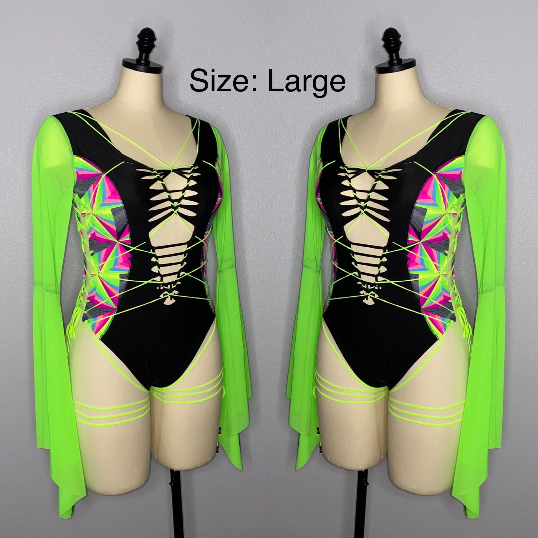 Fabric of bodysuit is one layer of light weight nylon/spandex blend (4-way stretch and breathable) and sleeves are power mesh.