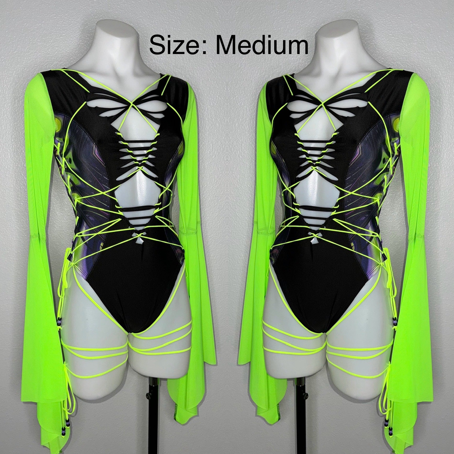 Fabric of bodysuit is one layer of light weight nylon/spandex blend (4-way stretch and breathable) and sleeves are power mesh.