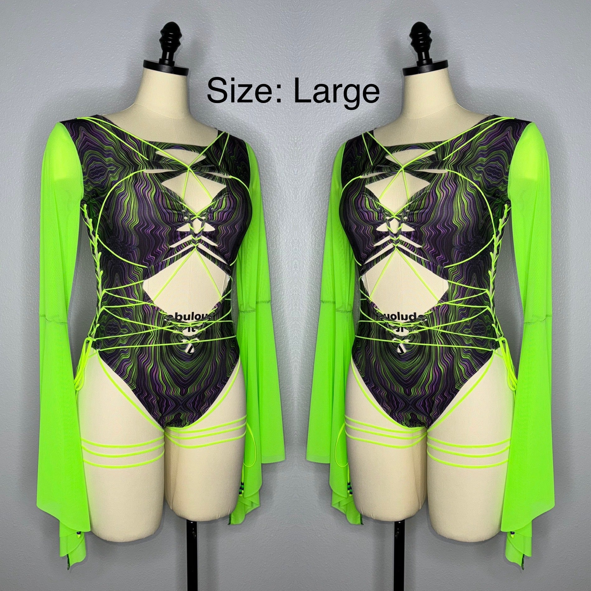 Fabric of bodysuit is one layer of light weight nylon/spandex blend (4-way stretch and breathable) and sleeves are power mesh.