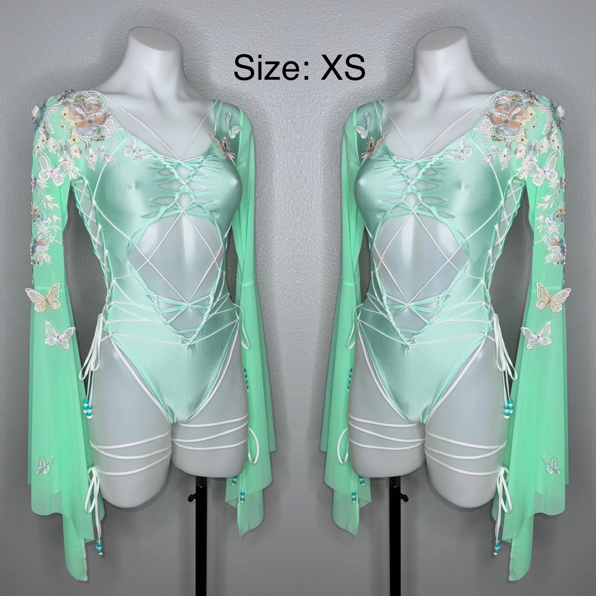 Fabric of bodysuit is one layer of light weight nylon/spandex blend (4-way stretch and breathable) and sleeves are power mesh. This fabric is sheer and comes with matching strappy bottoms for extra coverage.