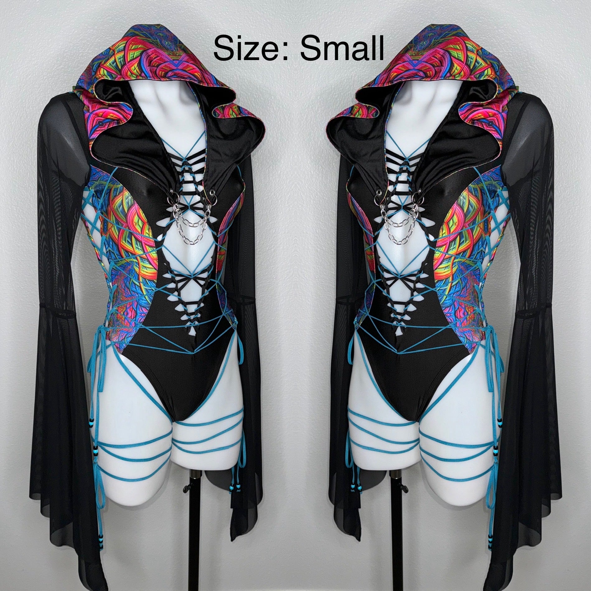 Fabric of bodysuit is one layer of light weight nylon/spandex blend (4-way stretch and breathable) and sleeves are power mesh.