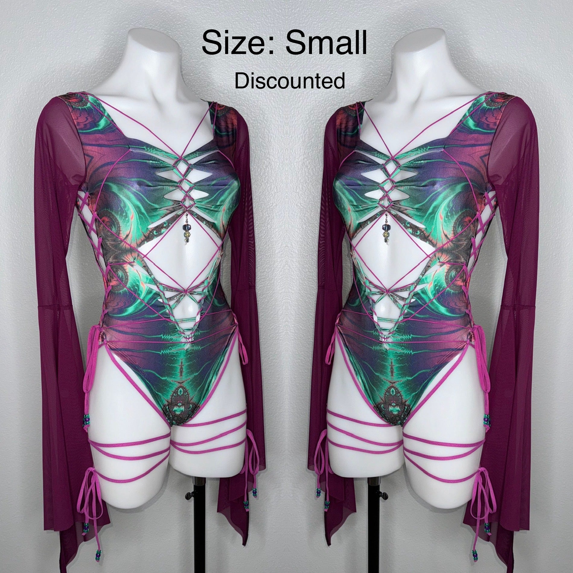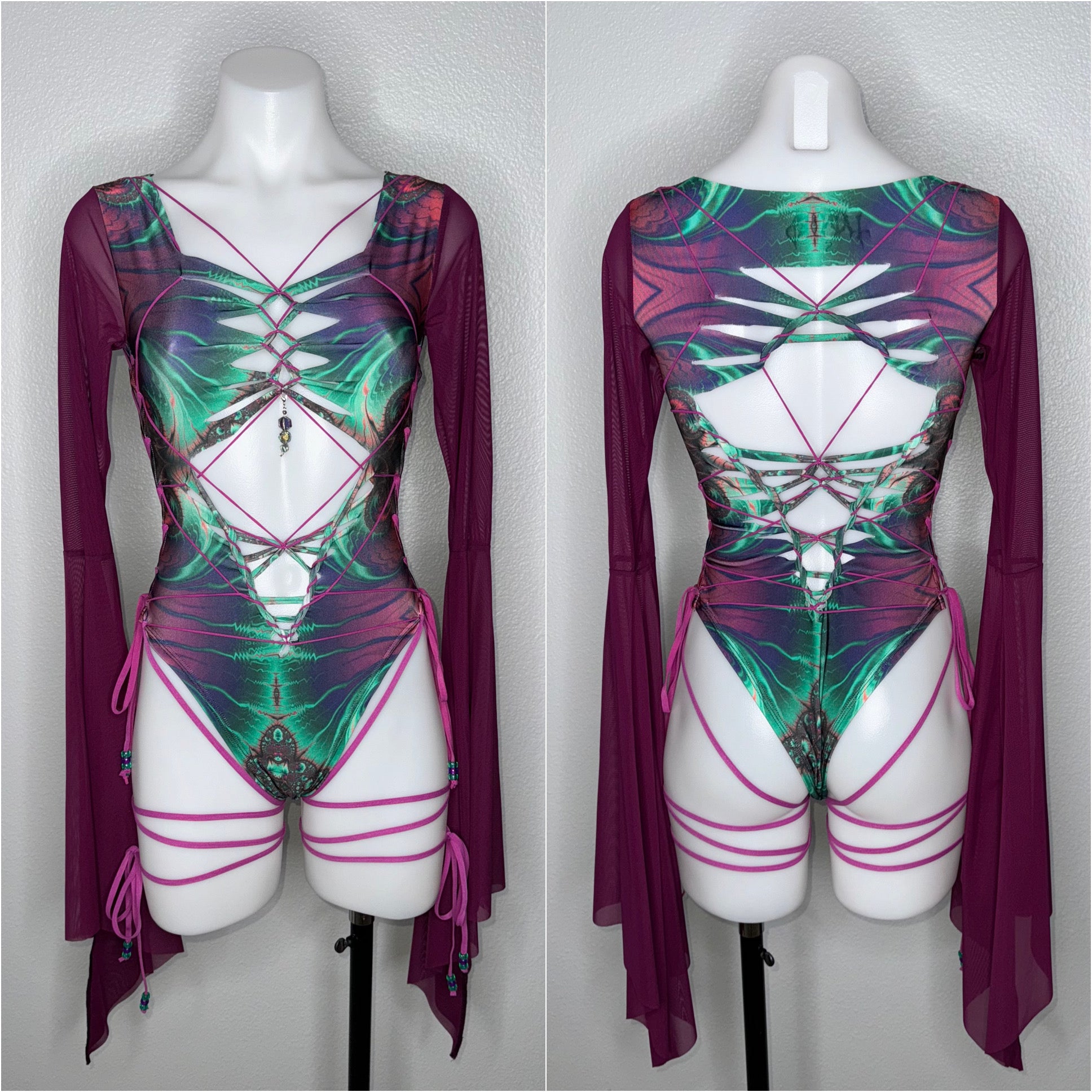 Fabric of bodysuit is one layer of light weight nylon/spandex blend (4-way stretch and breathable) and sleeves are power mesh. There is a small white dot on the back of this bodysuit from a printing error, which is why it has been discounted.
