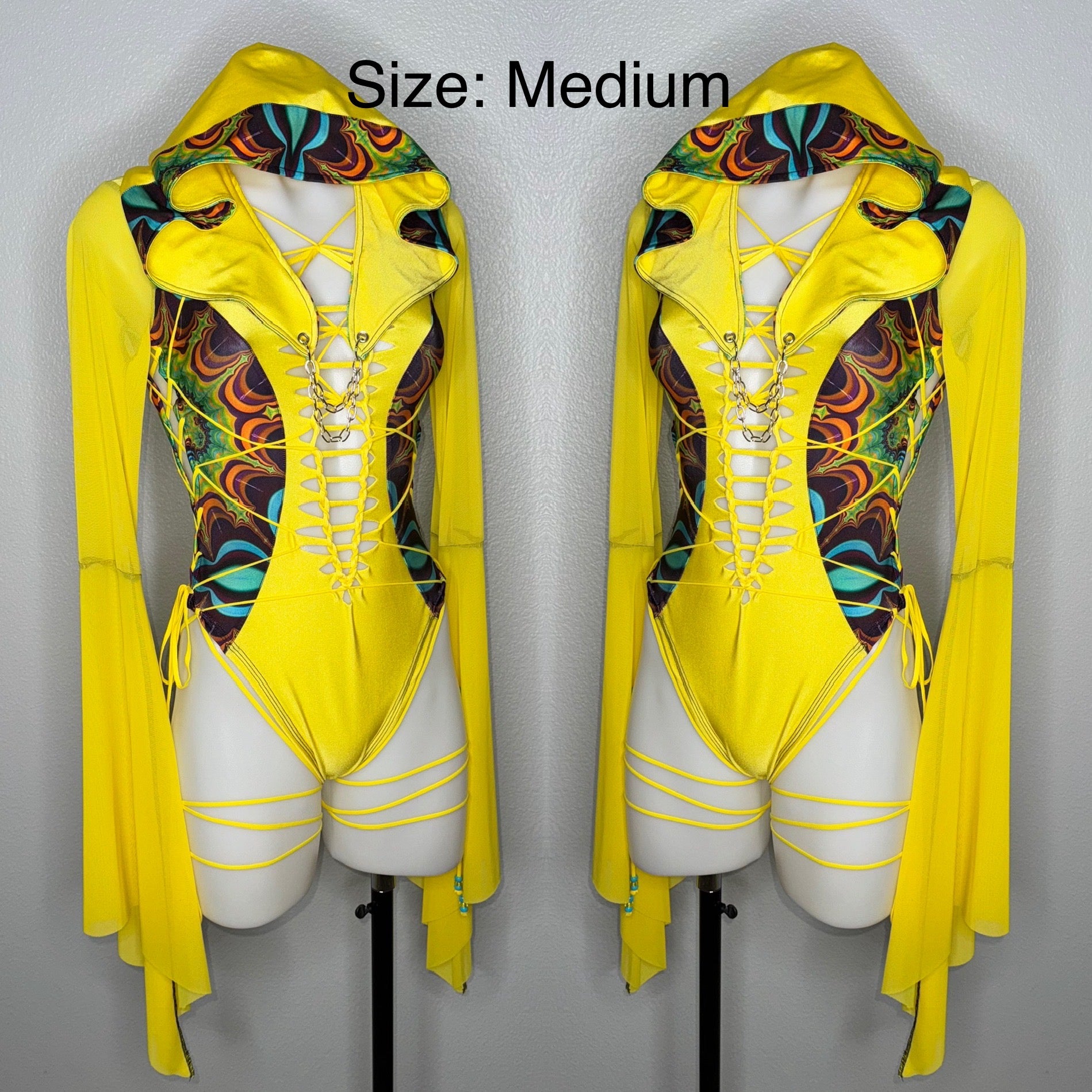 Fabric of bodysuit is one layer of light weight nylon/spandex blend (4-way stretch and breathable) and sleeves are power mesh. This fabric is sheer, if you would like to purchase yellow matching bottoms please email.