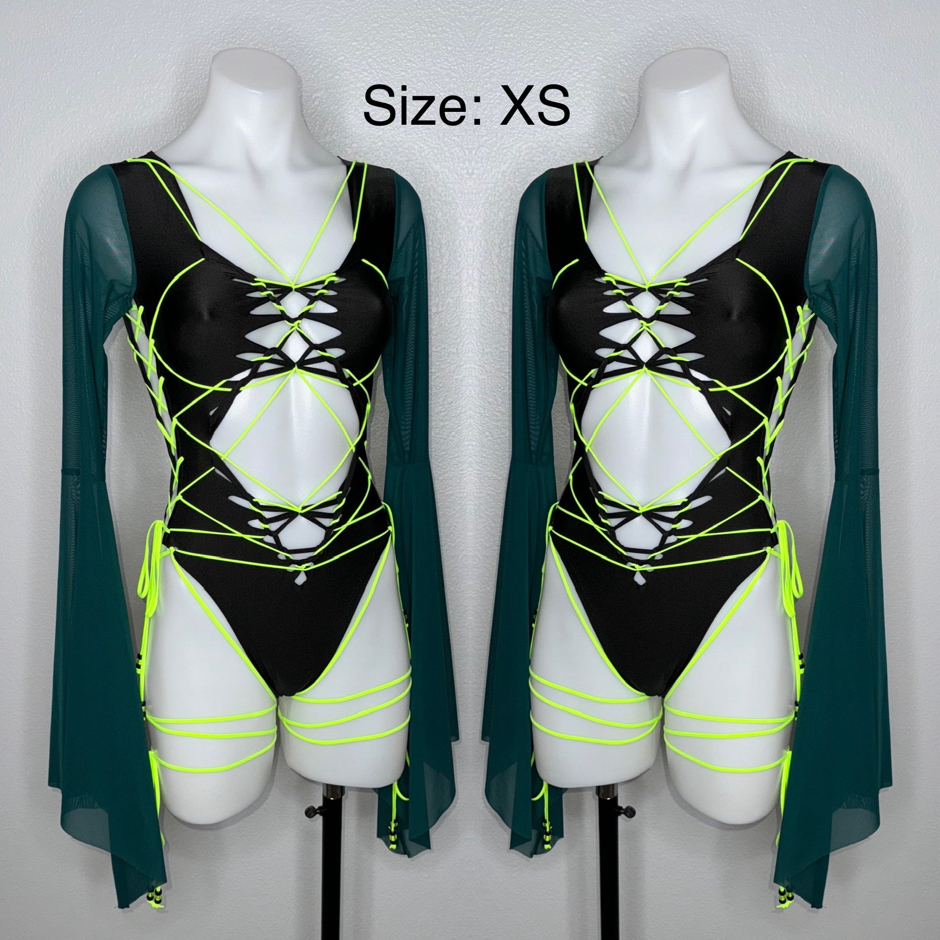 Fabric of bodysuit is one layer of light weight nylon/spandex blend (4-way stretch and breathable) and sleeves are power mesh.