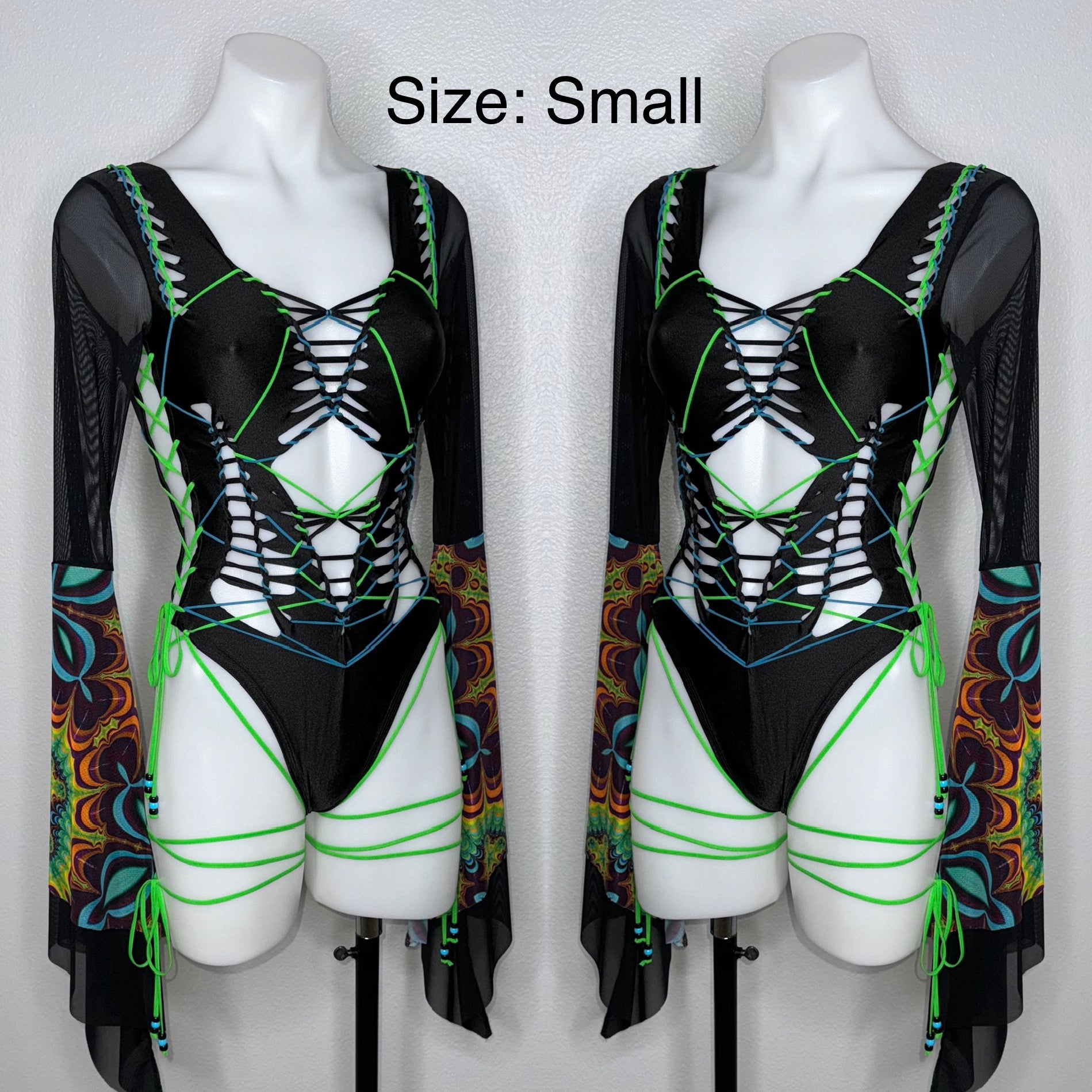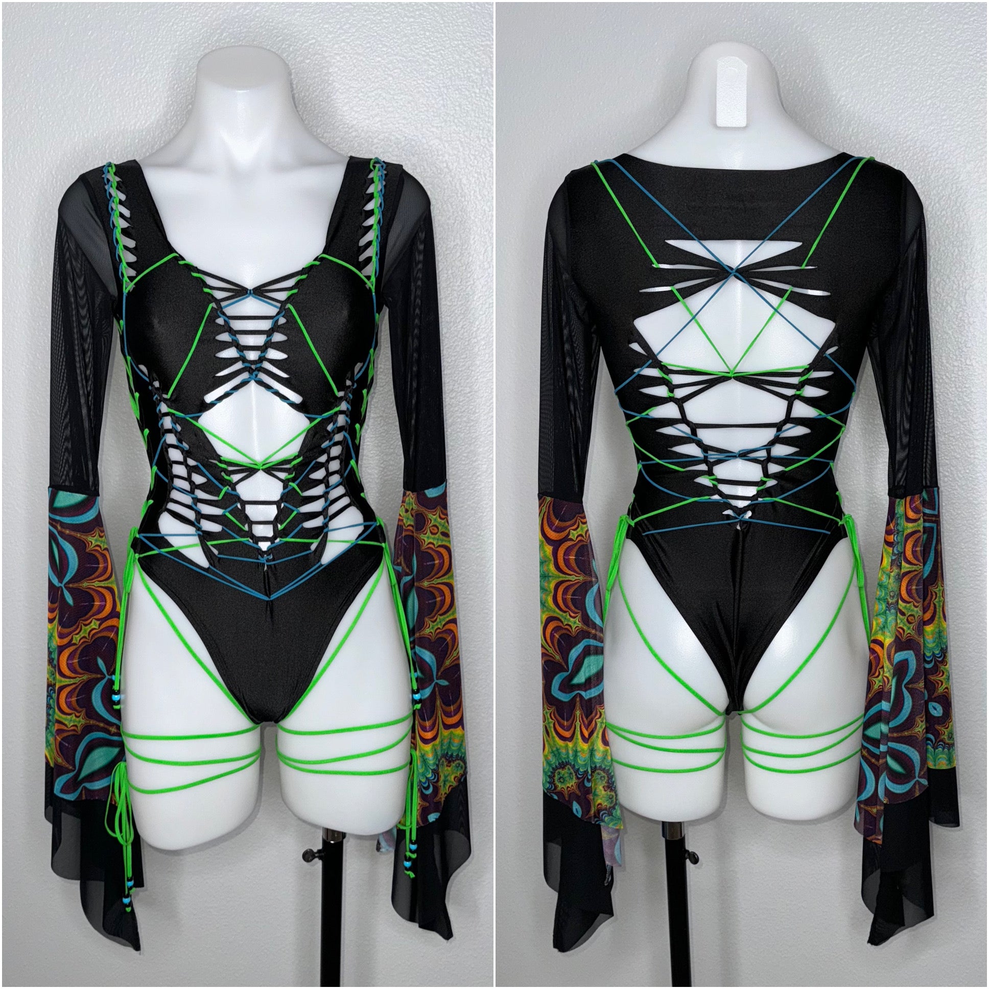 Fabric of bodysuit is one layer of light weight nylon/spandex blend (4-way stretch and breathable) and sleeves are power mesh.