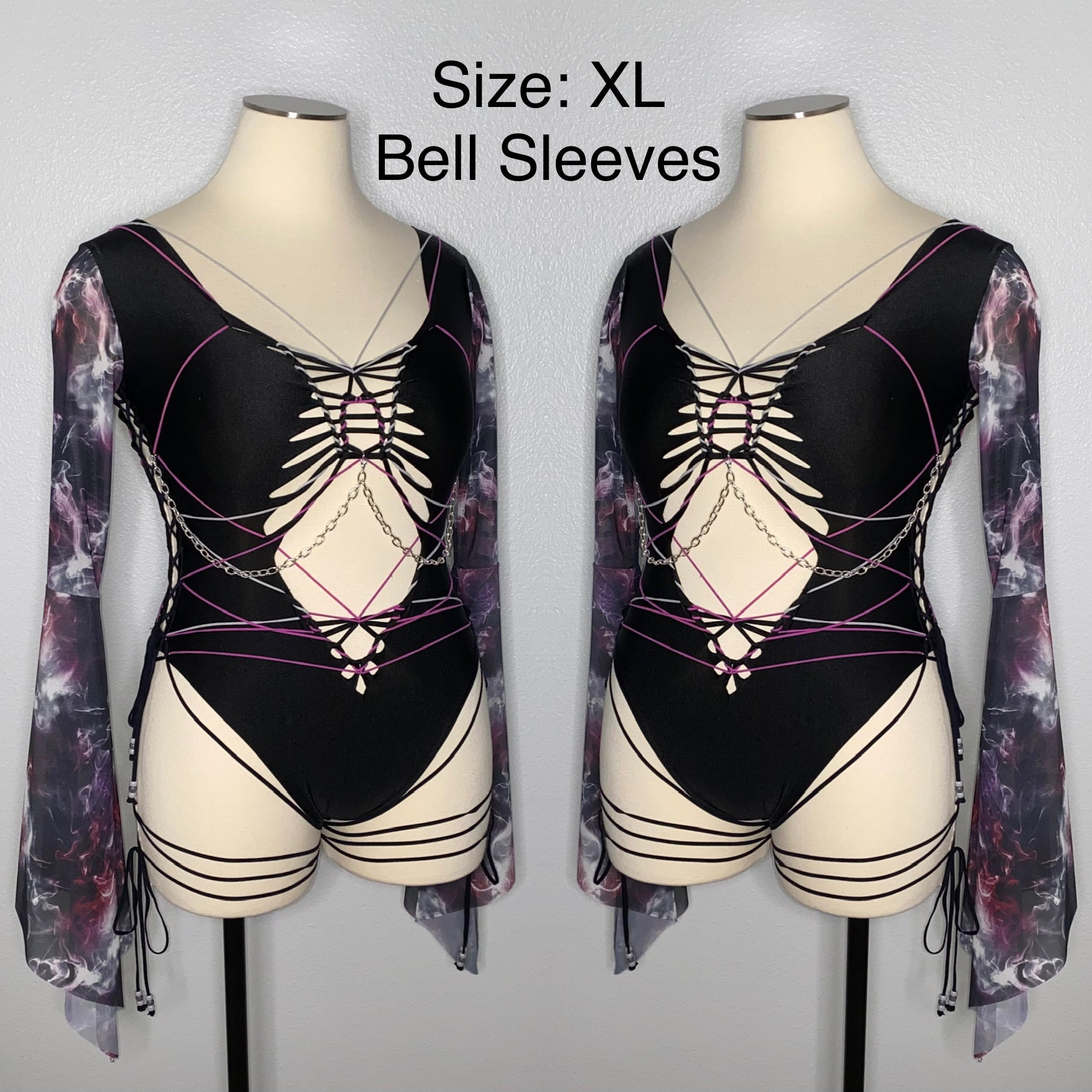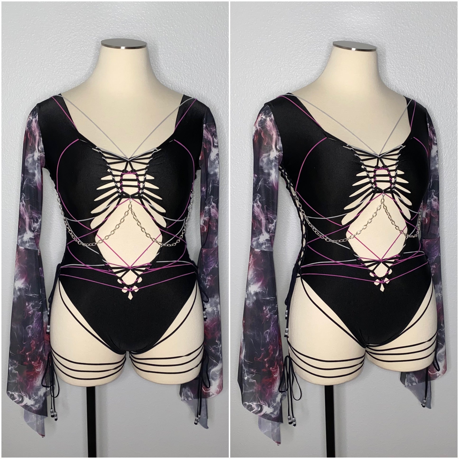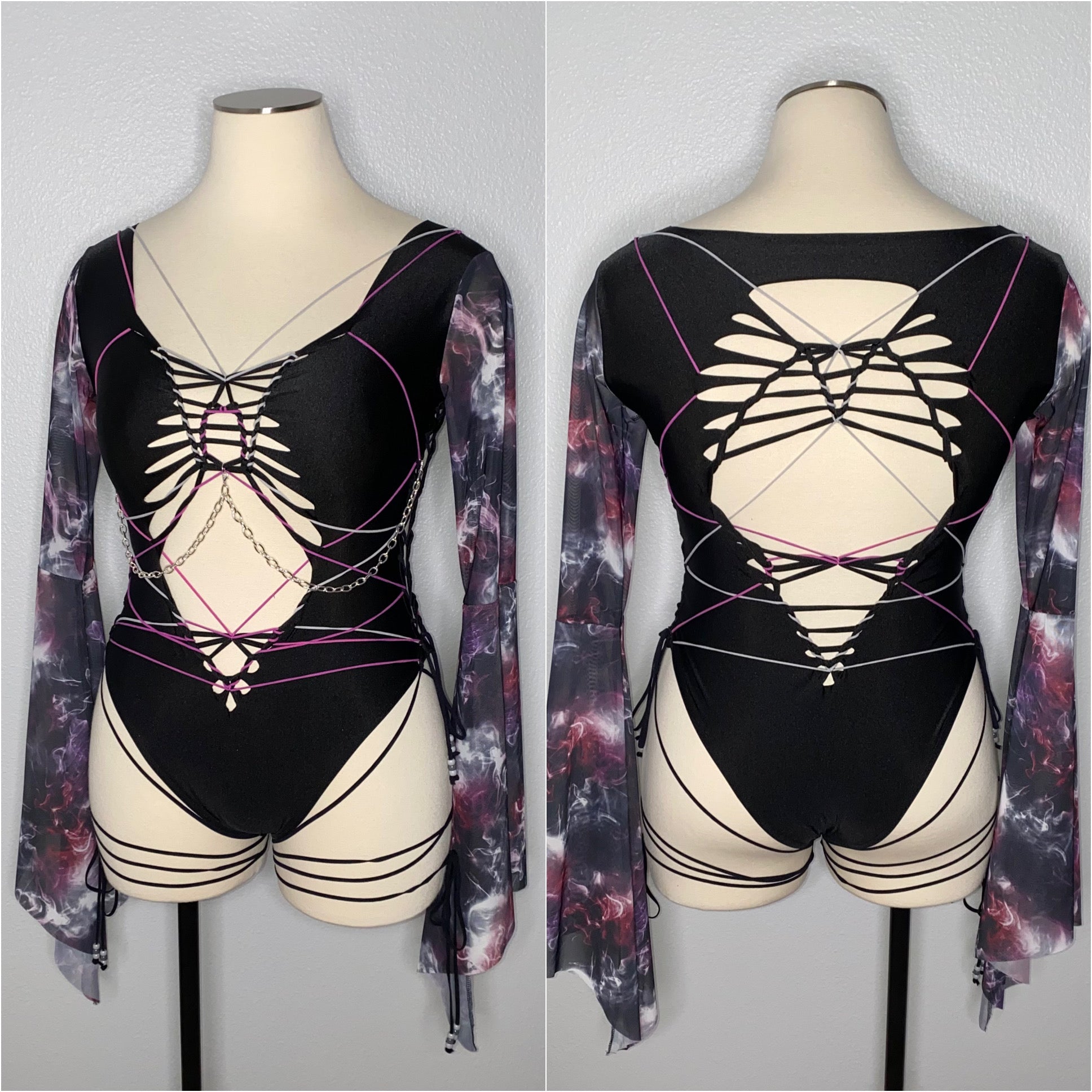 Hand braided bodysuit with grey and maroon elastic detail, removable chain detailing and is a size XL. Fabric of bodysuit is one layer of light weight nylon/spandex blend (4-way stretch and breathable) and sleeves are power mesh.