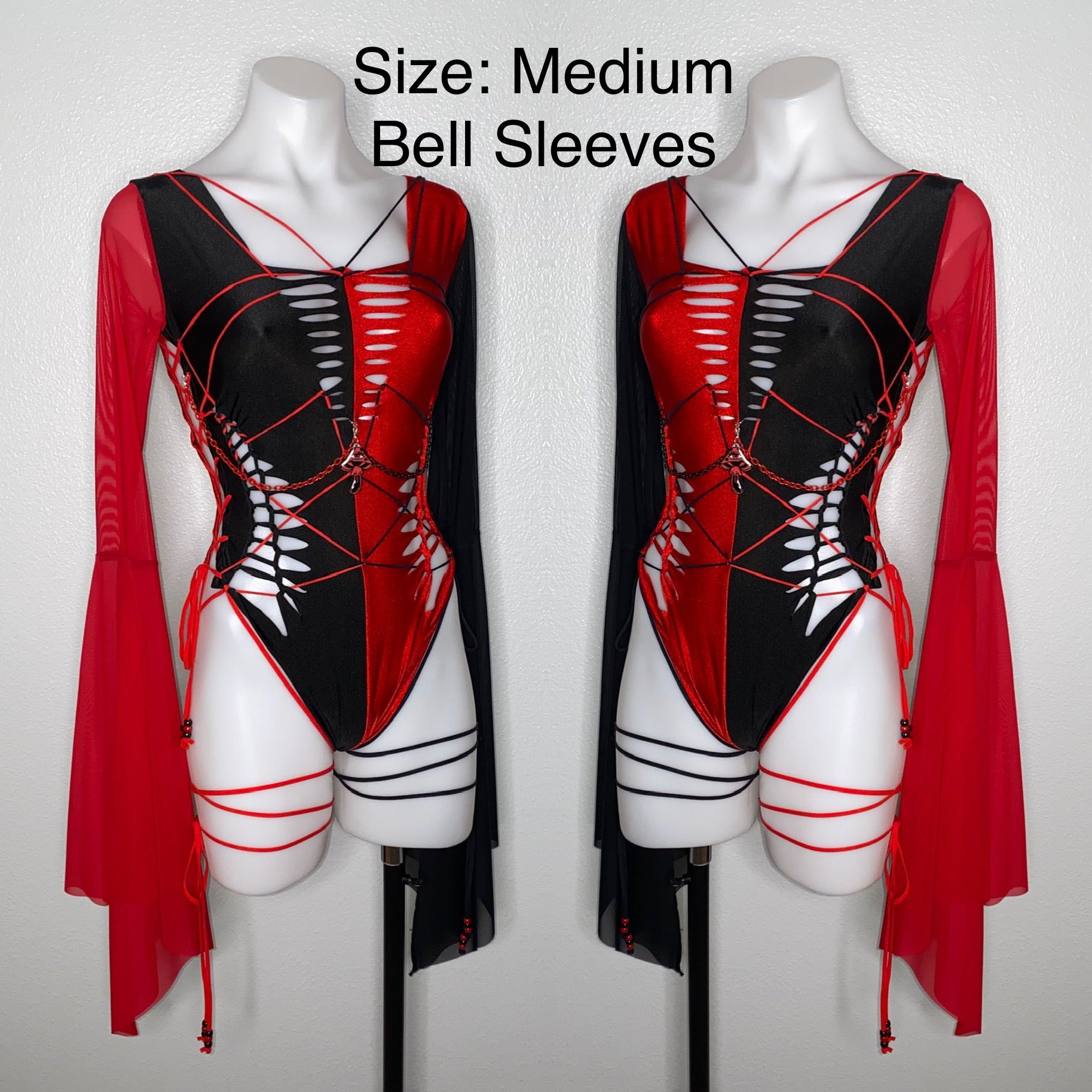 Hand braided bodysuit with red and black elastic detail, removable chain detailing with TinyHandsCult charm and is a size medium. Fabric of bodysuit is one layer of light weight nylon/spandex blend (4-way stretch and breathable) and sleeves are power mesh.