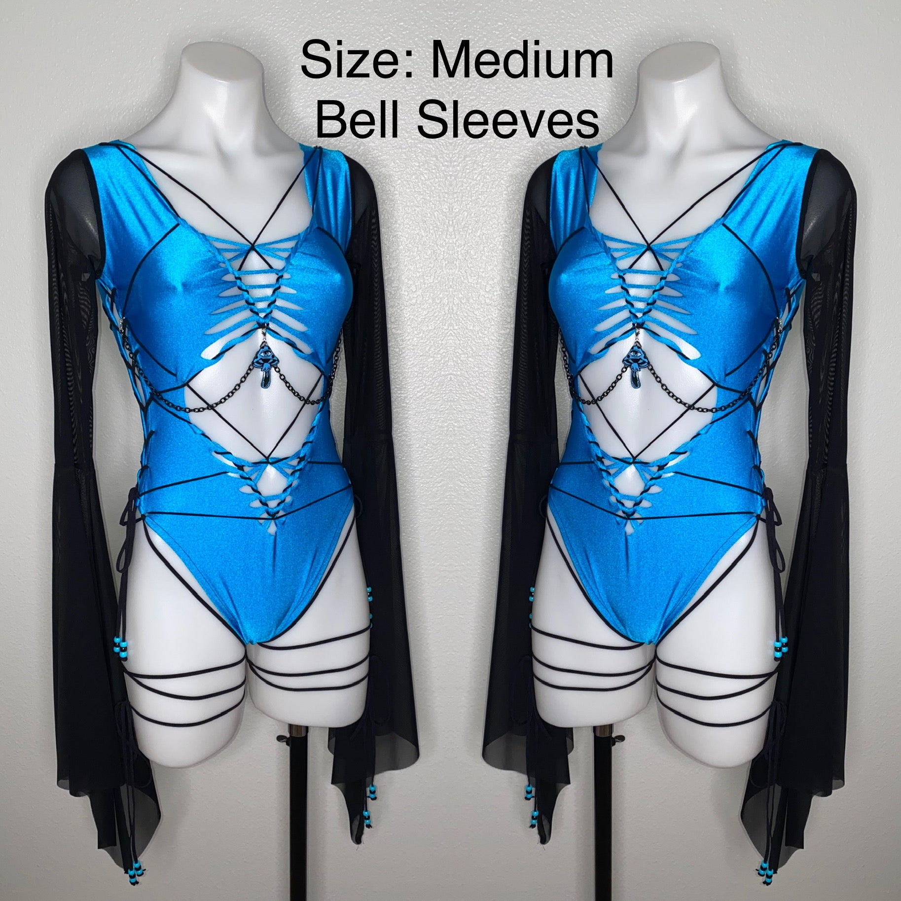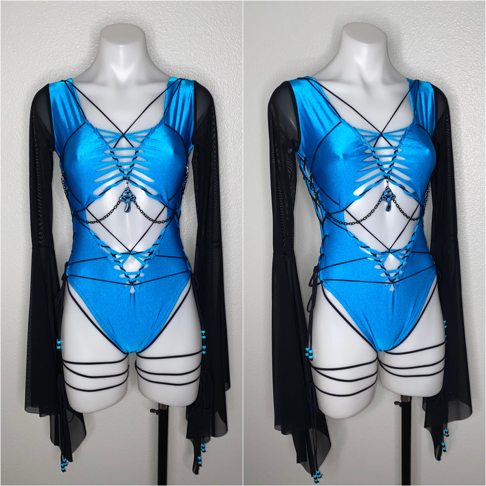 Hand braided bodysuit with black elastic detail, removable chain detailing with TinyHandsCult charm and is a size medium. Fabric of bodysuit is one layer of light weight nylon/spandex blend (4-way stretch and breathable) and sleeves are power mesh.