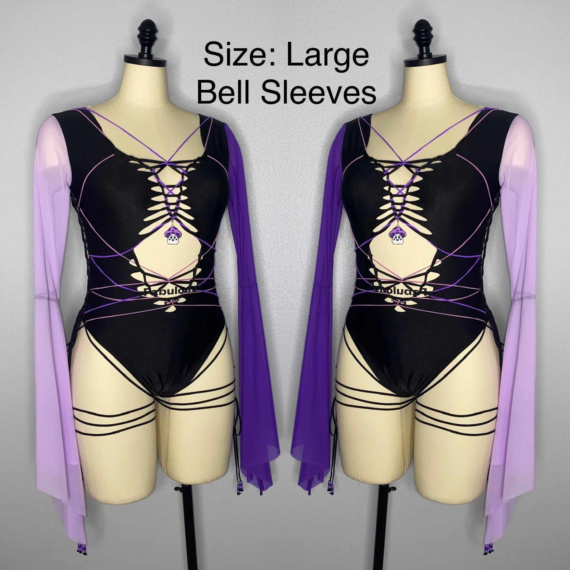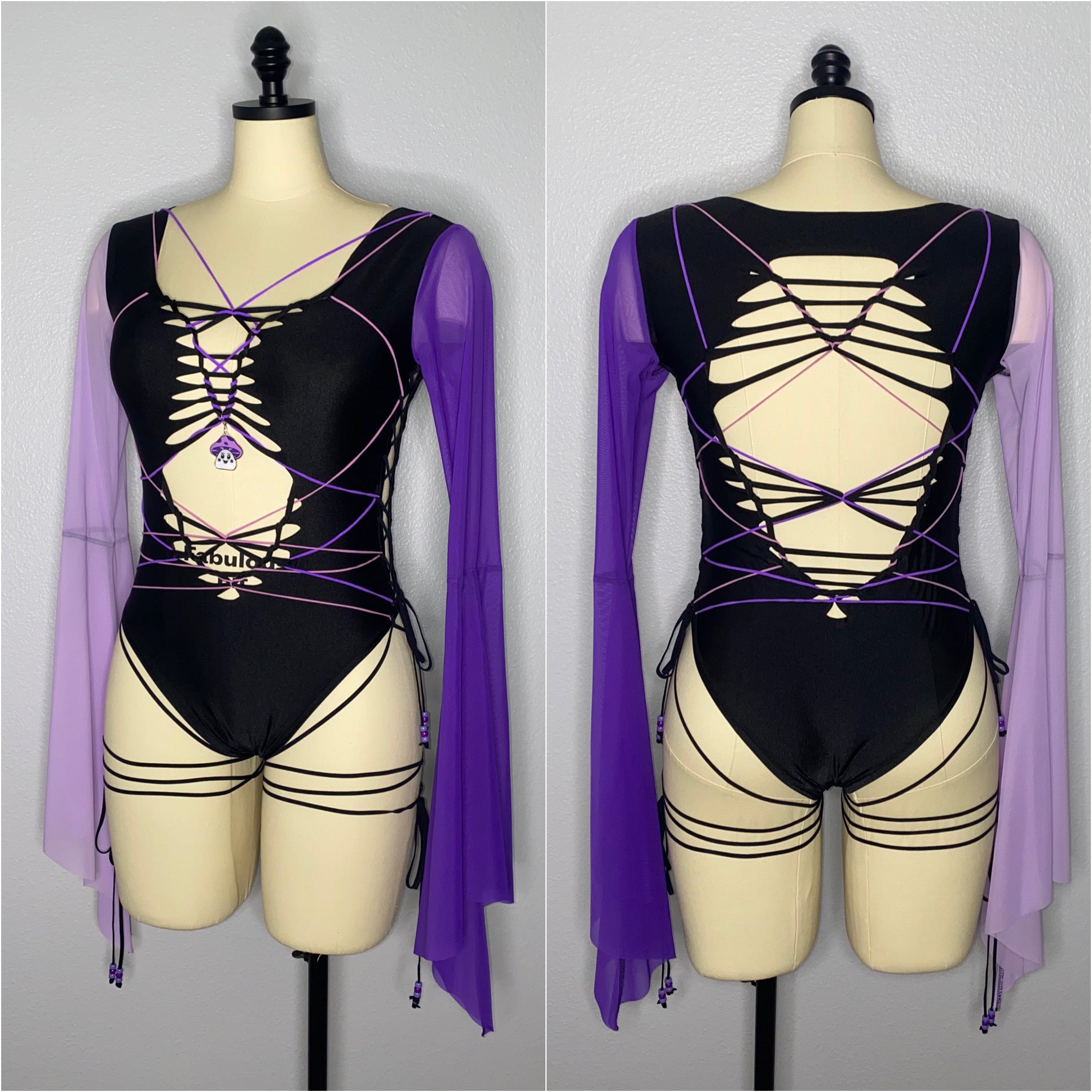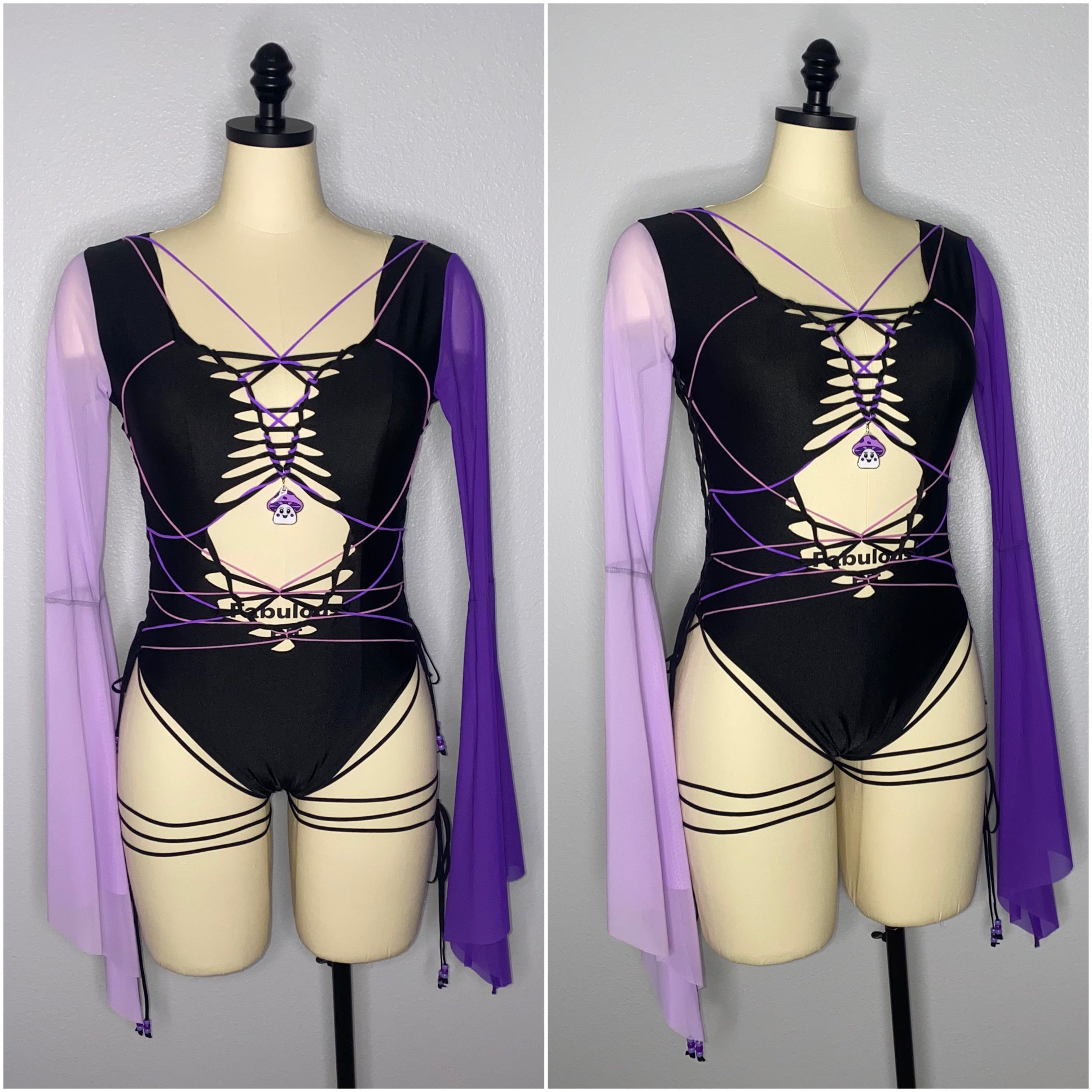 Hand braided bodysuit with purple elastic detail, removable chain detailing with TinyHandsCult charm and is a size large. Fabric of bodysuit is one layer of light weight nylon/spandex blend (4-way stretch and breathable) and sleeves are power mesh.