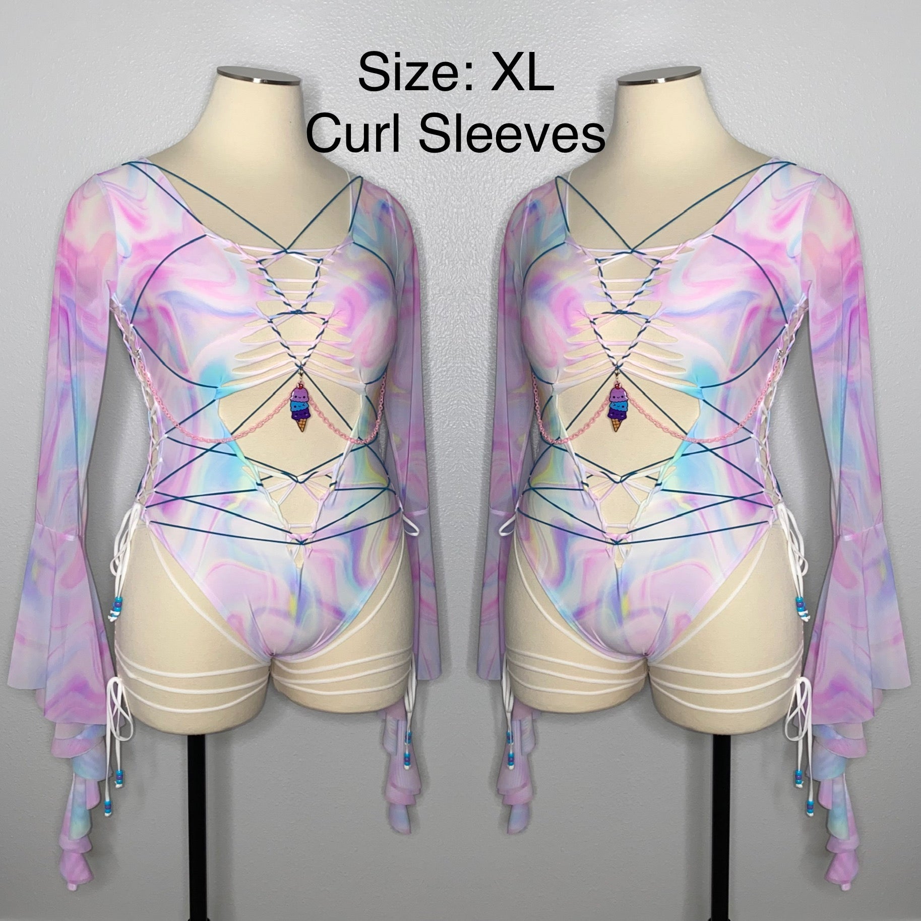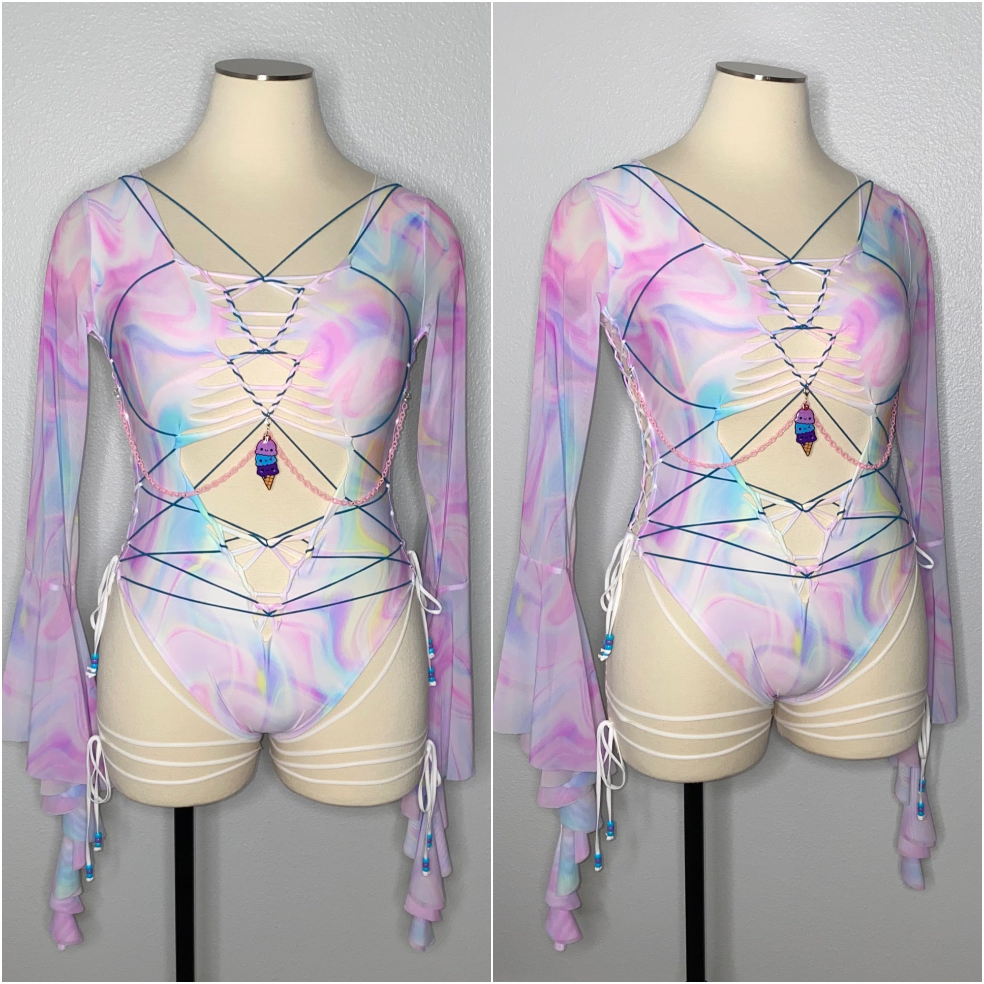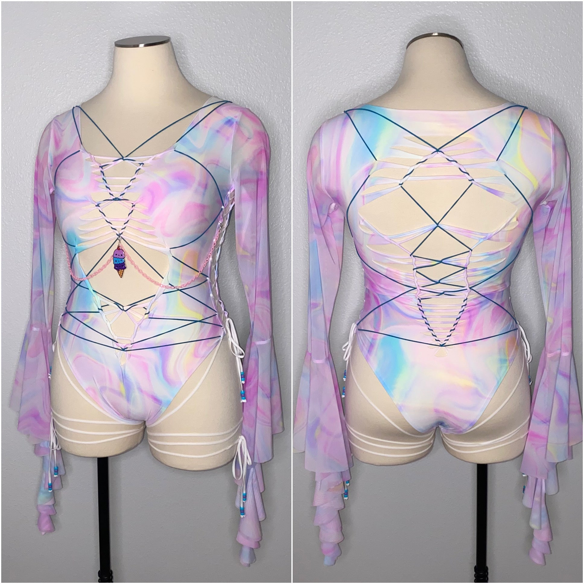 Hand braided bodysuit with blue elastic detail, removable chain detailing with TinyHandsCult charm and is a size XL. Fabric of bodysuit is one layer of light weight nylon/spandex blend (4-way stretch and breathable) and sleeves are power mesh.